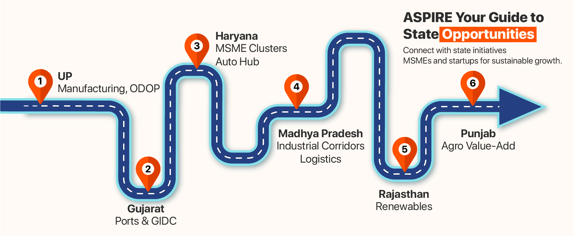 A Guided Roadmap for Investors ASPIRE connects investors with India’s most promising MSMEs and Startups through a clear, structured roadmap. Our strong ecosystem and grassroots reach open doors to ventures that are driving innovation, sustainability, and inclusive growth.